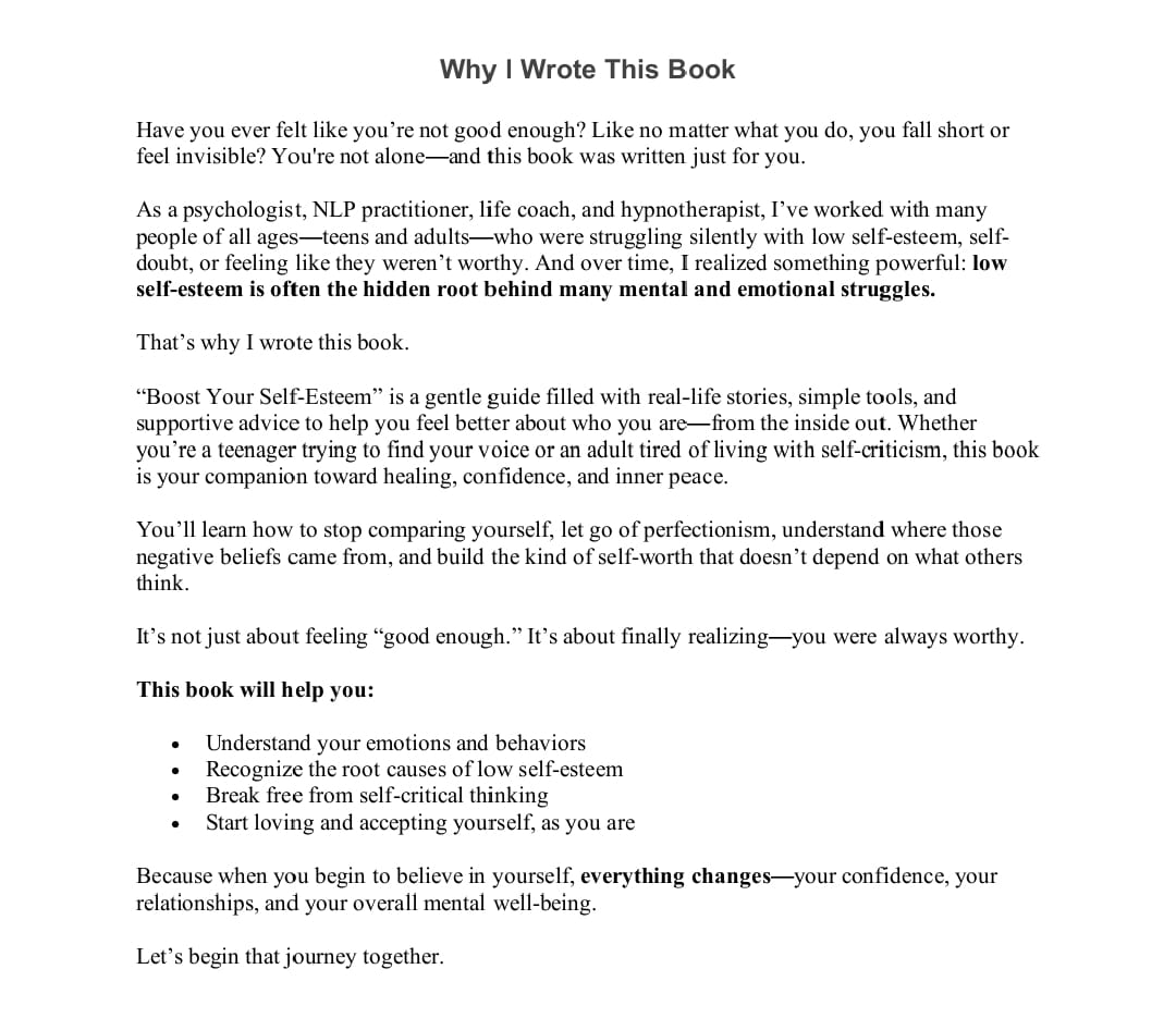 “Boost Your Self-Esteem” is a gentle guide filled with real-life stories, simple tools, and supportive advice to help you feel better about who you are—from the inside out. Whether you’re a teenager trying to find your voice or an adult tired of living with self-criticism, this book is your companion toward healing, confidence, and inner peace.